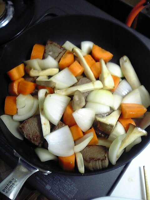 はじめにジャガイモ以外の材料を炒めます。