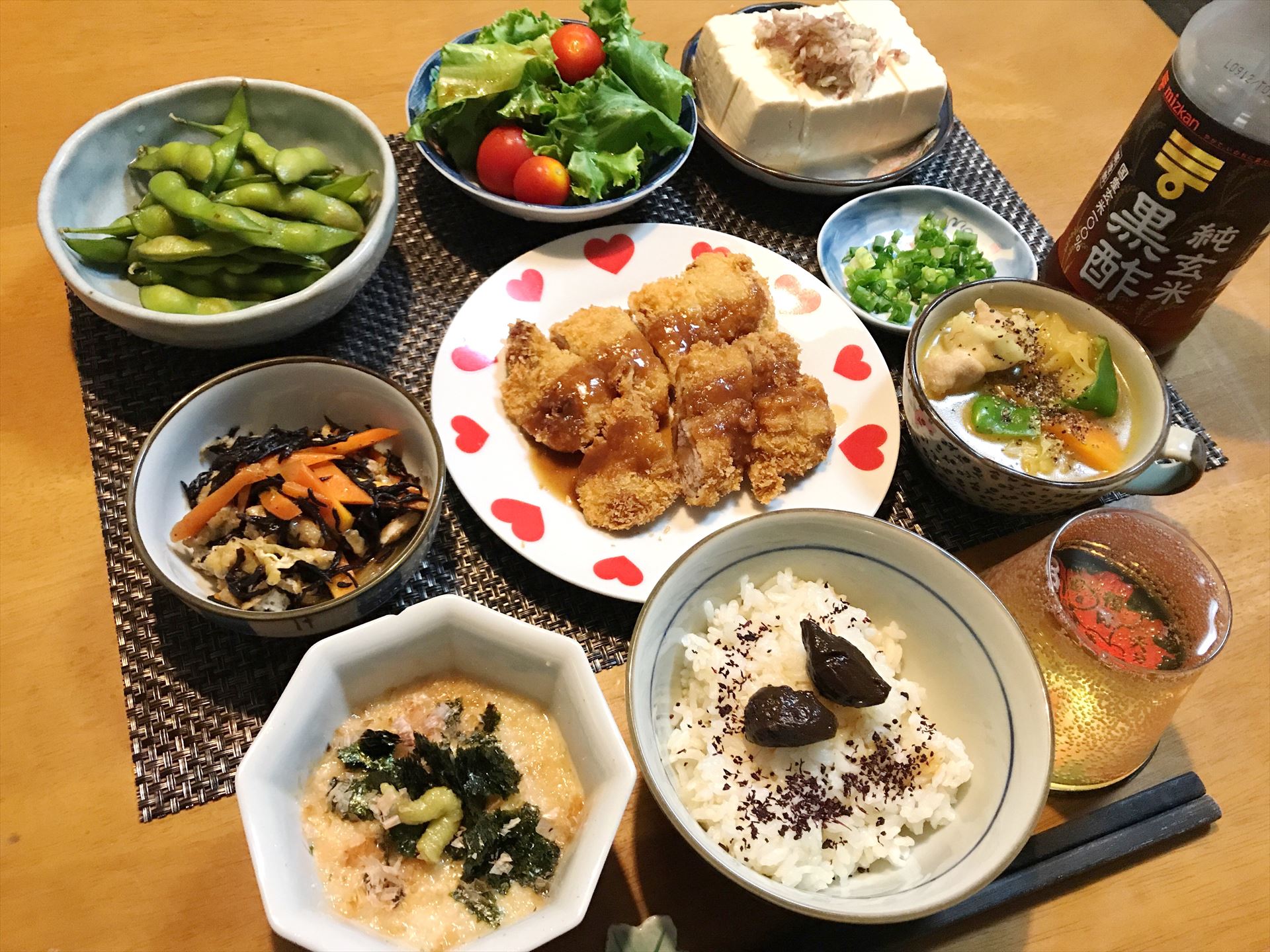 ・ヒレカツ ・長芋のすりおろし ・プチトマトとレタス ・枝豆 ・ひじきの煮物 ・豚バラ肉のカレースープ ・冷奴(小葱、ミョウガ) ・胚芽米(黒ニンニク、ゆかり) ・黒酢のソーダ割り